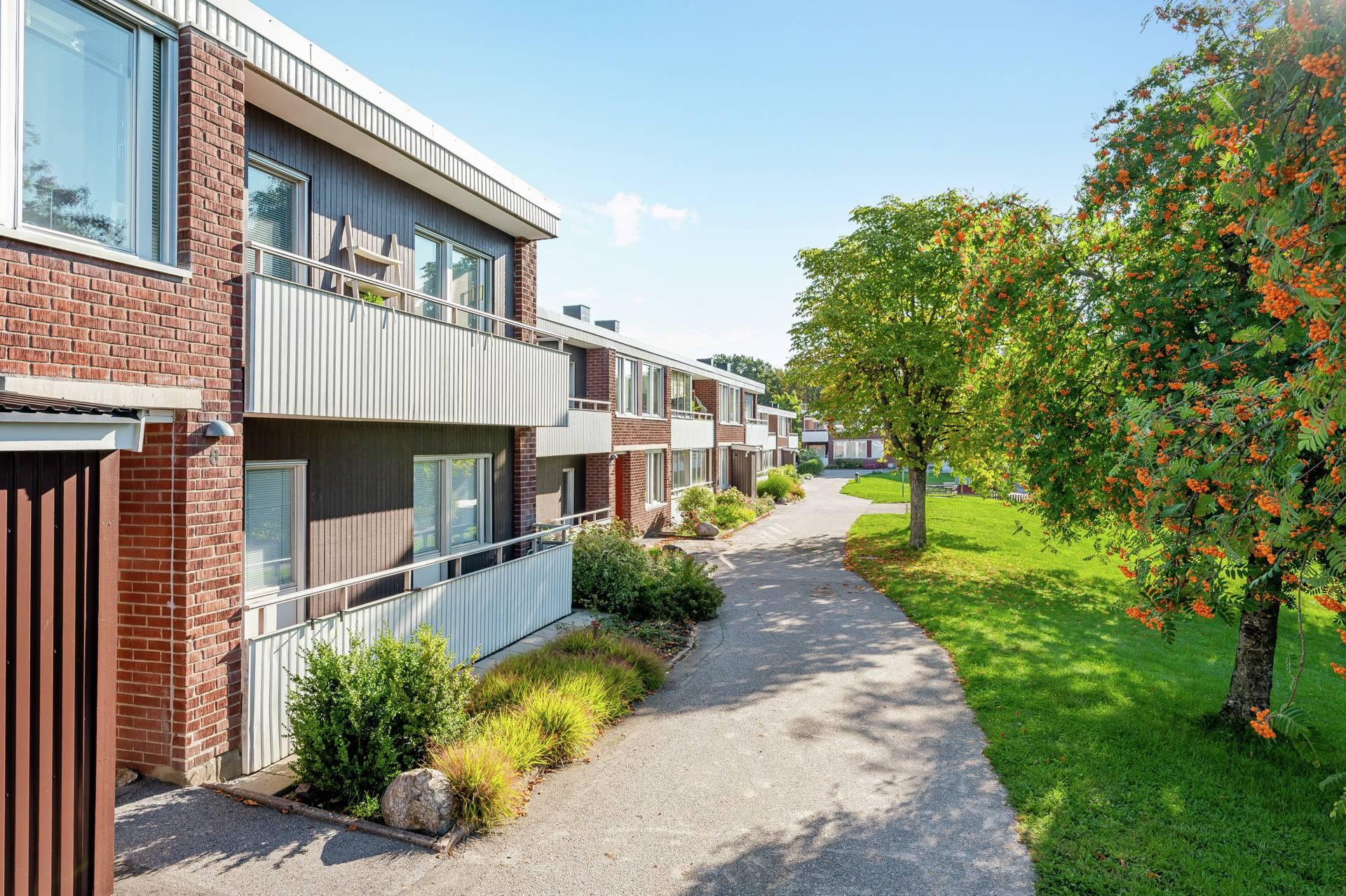Husen ligger i härliga omgivningar med träd och grönytor samt flera lekparker. Områdets fyra pergolas är uppskattade platser för umgänge under årets varmaste månader. Flera förskolor och en skola finns i området.