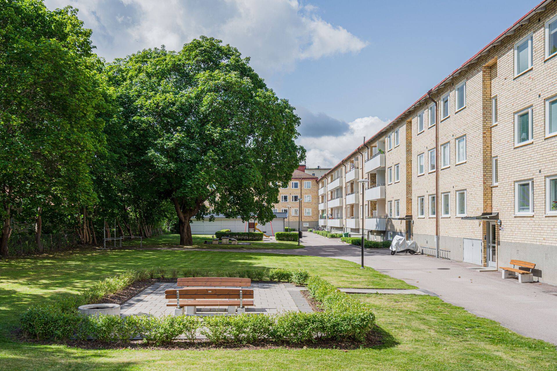 Lummig innergård med lekplats och sällskapsytor.